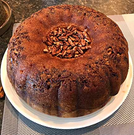 When cake is ready, remove from oven and leave in the pan. With a chopstick, poke holes in the top of the cake and carefully drizzle about half the glaze on top, filling all the holes. When the glaze is absorbed, turn out the cake to the serving plate and repeat the process with the remaining glaze. Fill the hole with the remaining pecans and set aside to cool!