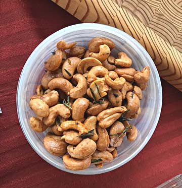Preheat oven to 375 degrees. On a cookie sheet, roast the cashews for about 10 minutes - turning occasionally to ensure even roasting. Meanwhile, combine the rosemary, salt, brown sugar and cayenne to melted butter. When the cashews are roasted, pour into to a bowl and mix in the butter/spice mixture. Combine well. Nuts will be very hot so use caution!!