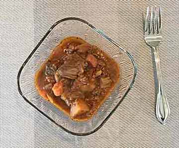 Cook garlic with onions until soft, add beer and stir with a wooden spoon to get all the browned bits off the bottom. Pour into stew pot. Stir in tomato paste, thyme, carrots, celery, sugar, 1/2 tsp black pepper and enough chicken broth to cover.